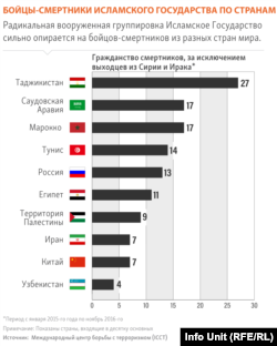 Гаагадағы Терроризмге қарсы күрес жөніндегі халықаралық орталықтың (ICCT) баяндамасында 2015 жылдың желтоқсаны мен 2016 жылдың қарашасы аралығында 27 тәжіктің өзін ажалға қиғаны айтылады. Мемлекеті анықталған шетелдік азаматтар арасында бұл – ең жоғары көрсеткіш.